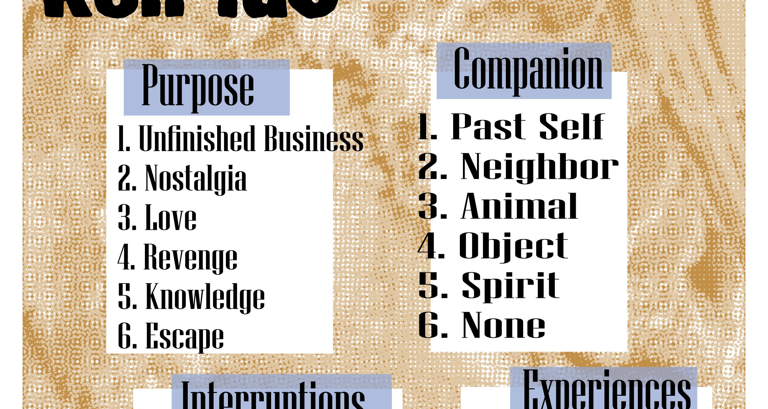 You find yourself decidedly dead, holding a ticket in what you believe to be the afterlife. A kind, elderly woman explains the strict time constraint placed upon your complimentary travel. Where will you go? How will you spend your time?
